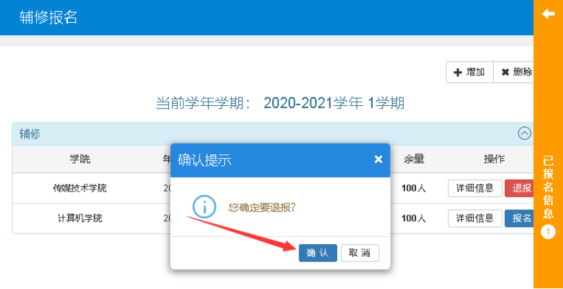 7.若要取消报名或修改报名专业,需先将已报名专业退报,在辅修报名界面,点击报名专业对应的退报按钮